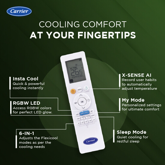 It offers multiple Ambient Lighting color options through Carrier Smart Connect 2.0 app and Red, Green, Blue and White Ambient light with remote.