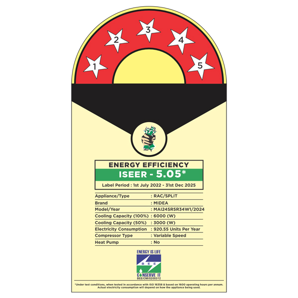 ***BEE (Bureau of Energy Efficiency) an autonomous body under Ministry of Power, Government of India, started this initiative of star rating basis ISEER ranging from 1 Star to 5 Star, Annual Electricity Consumption (Units or kWh basis 1600 hrs).