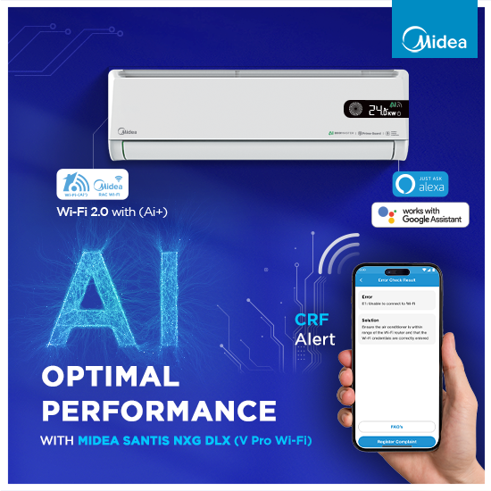 The SANTIS NXG RYL V Pro Wi-Fi Inverter AC is built for premium, connected living. With Prime Guard (Hydro Blue Fin Coating), AI Ecomaster, Smart Voice Control & Responsive Display, and Wi-Fi 2.0 connectivity, it ensures effortless control, efficient cooling, and enhanced durability.